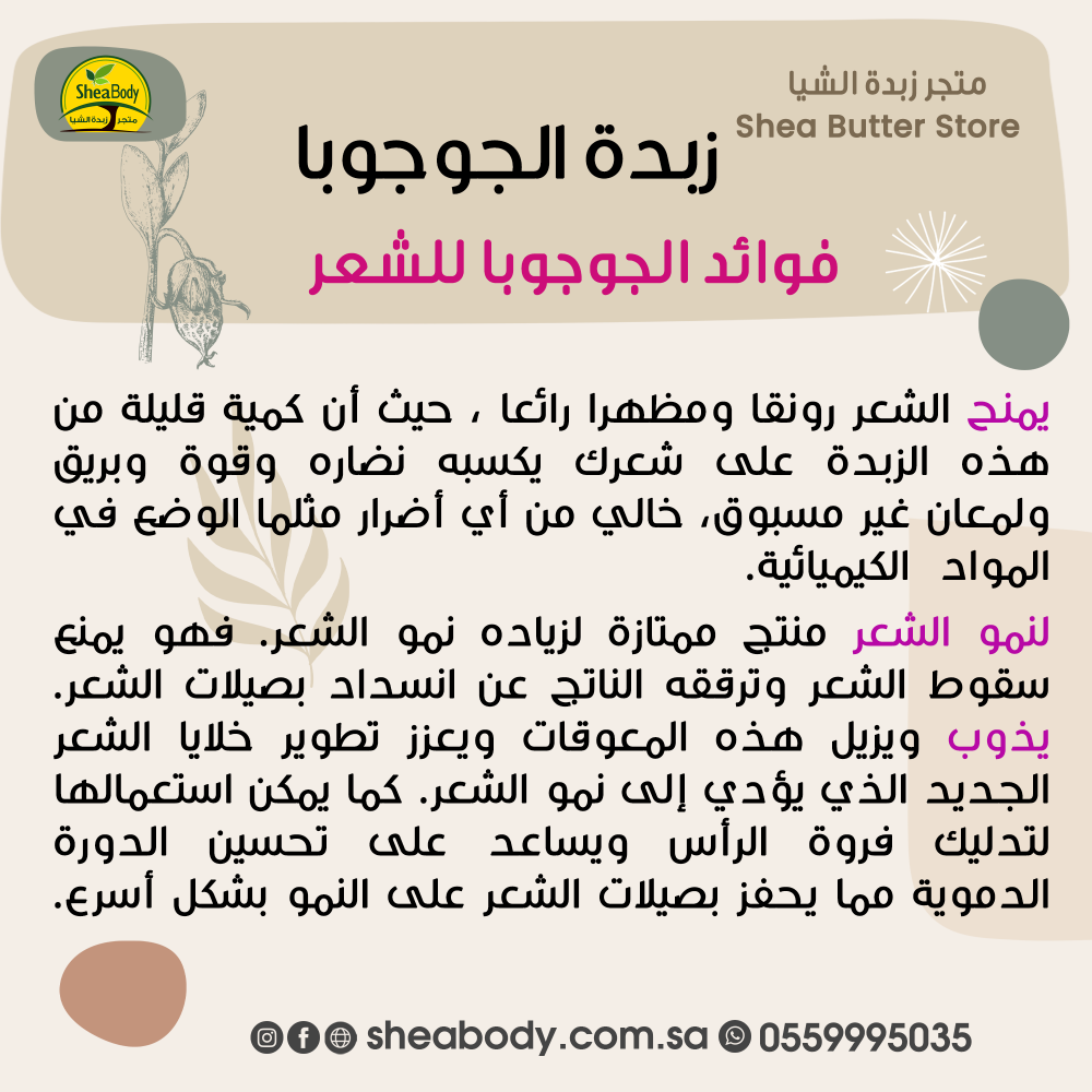 يحتوي الجوجوبا على تركيبة زيتية ويستخدم في اصلاح الأضرار التي تنتج عن استخدام الكيمياويات في الشعر مثل تقصف الشعر وسقوطه وغيرها من مخلفات عمليات الفرد الكيمائي، حيث أنه زيت طبيعي يؤثر بشكل إيجابي في نمو خصلات الشعر.