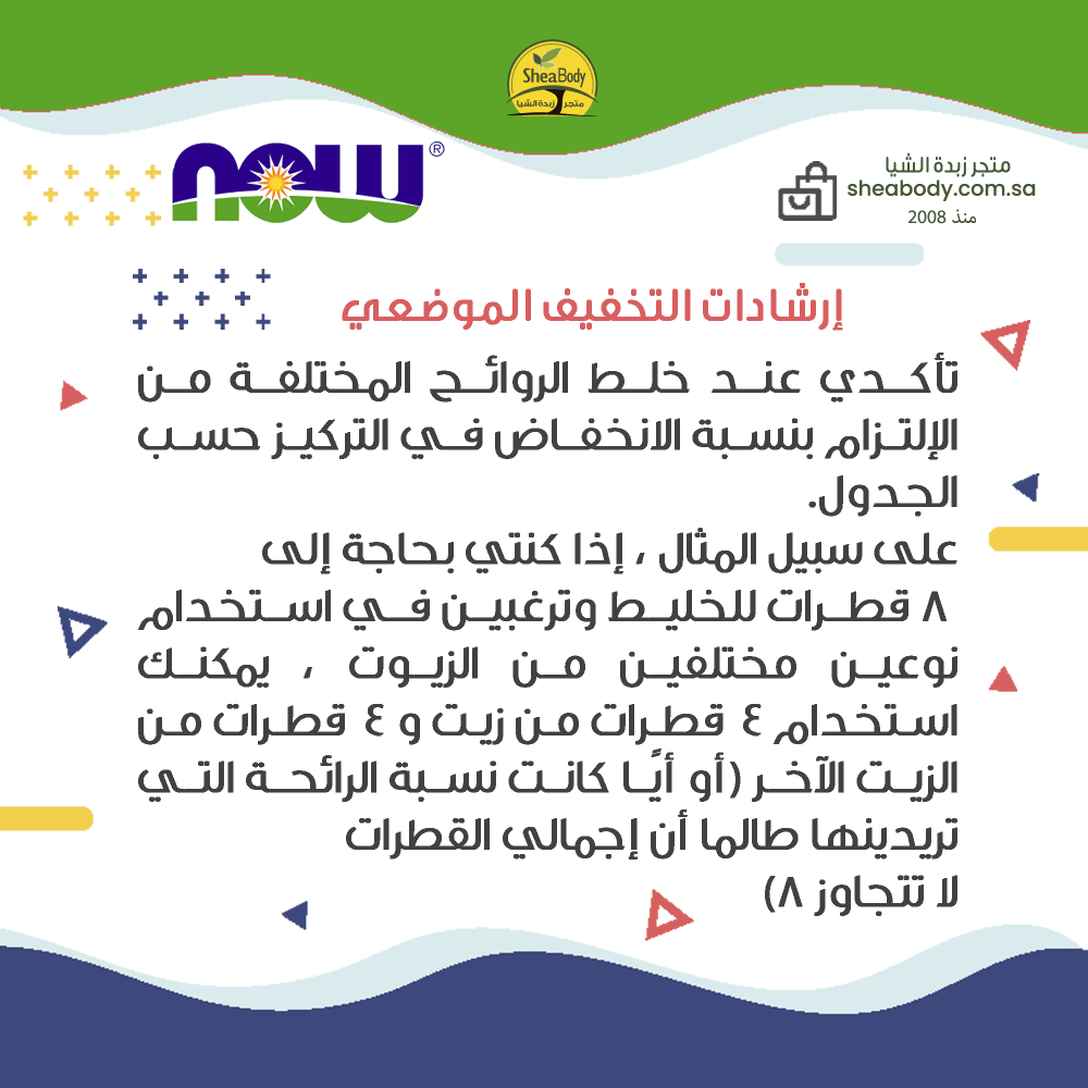 للاستخدامات الأخرى، قم بعناية بتخفيف الزيت باستخدام زيت وسيط الجوجوبا، بذور العنب، الزيتون، أو اللوز قبل الاستخدام. يرجى الرجوع إلى مرجع متخصص في الزيوت الأساسية أو أي مرجع مهني آخر لمعرفة نسب التخفيف المناسبة.